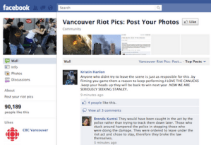 The Vancouver police have had no trouble enlisting citizens in the identification of rioters on the police department’s Facebook page. The department did well to update the page fairly quickly with a thread devoted to citizens photos of the rioters. However, the police quickly realized (as have some legal scholars) that the feeling of empowerment associated with social media combined with the demonization of the rioters in the national news media created the perfect conditions for online vigilantism.