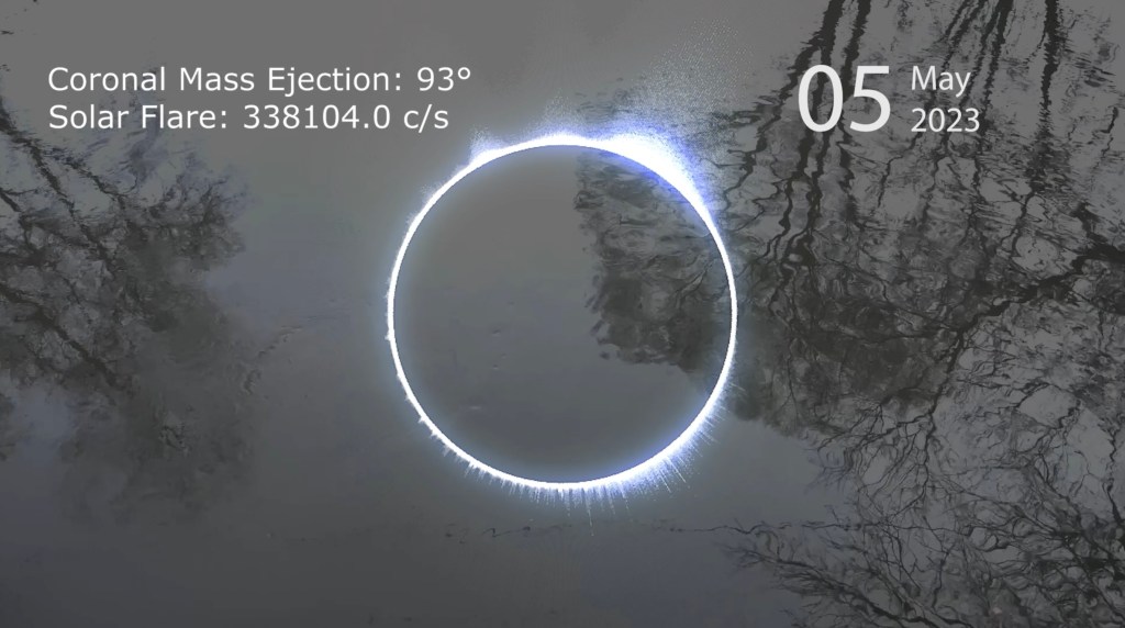 Since the TRCA’s data collection included solar radiation data, I was interested in exploring how other kinds of solar activity might be integrated into the composition as a way of connecting micro-level variations in water, wind, etc. at a specific site on the Don River to macro-level fluctuations of energy – not only on a planetary level but also on the heliospheric level (i.e., systems influenced by the sun). To do this, I integrated data from NASA’s First Fermi-LAT Solar Flare Catalog (FLSF) and the SEEDS catalogue of Coronal Mass Ejections and filtered the list to focus on events that had a high enough magnitude to affect GPS and other navigations systems as well as radio communications. These datasets were filtered so that they align with the 2023 data I obtained from the TRCA.