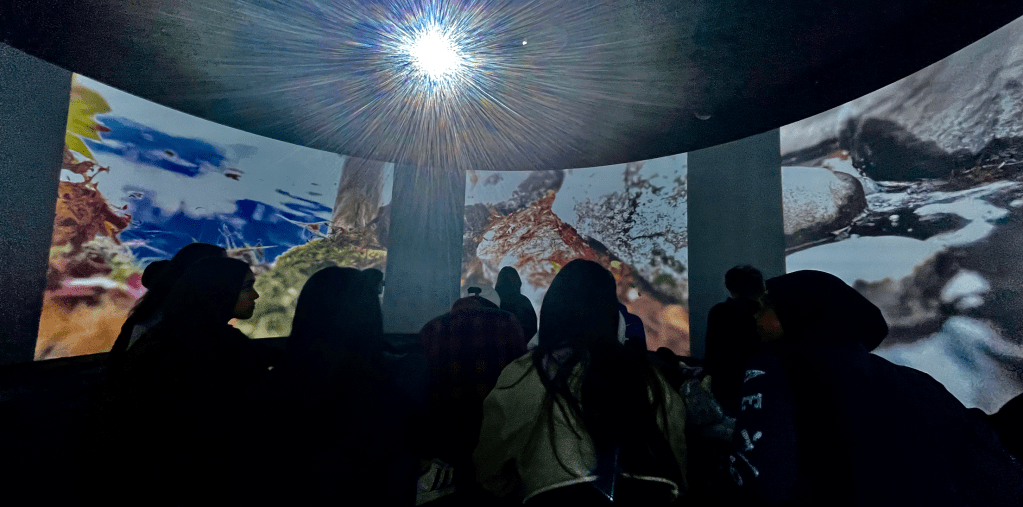 The composition was designed for the 360° screen in the Immersion Studio at Toronto Metropolitan University and was integrated into CMN 210 Text, Image, Sound – an undergraduate course I teach in the School of Professional Communication. The composition invites students and other listeners/viewers to consider “radiogenic community” as more than just a reaction to nuclear violence or a phenomenon that arises by virtue of a community’s exposure to radiation. Rather, this form of community emerges in the cases of the Dene and the hibakusha through repeated and determined efforts to reaffirm the existence and value of eco-social relations which bind together specific communities and places.