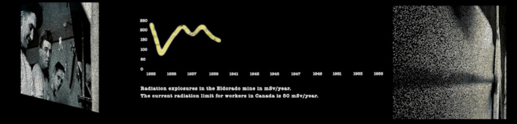My approach for exploring these questions through audiovisual composition is to re-center representations of nuclear violence around the epistemic agency of those subjected to it. I focus on two radiogenic communities: the Dene people, whose territory encompassed the Eldorado mine—where uranium was extracted for nuclear weapons production during the Second World War—and the hibakusha, survivors of the U.S. nuclear attacks on Japan. The composition combines archival materials related to nuclear imperialism in Canada with visualizations and sonifications of nuclear data collected by radiogenic communities and data visualizations.