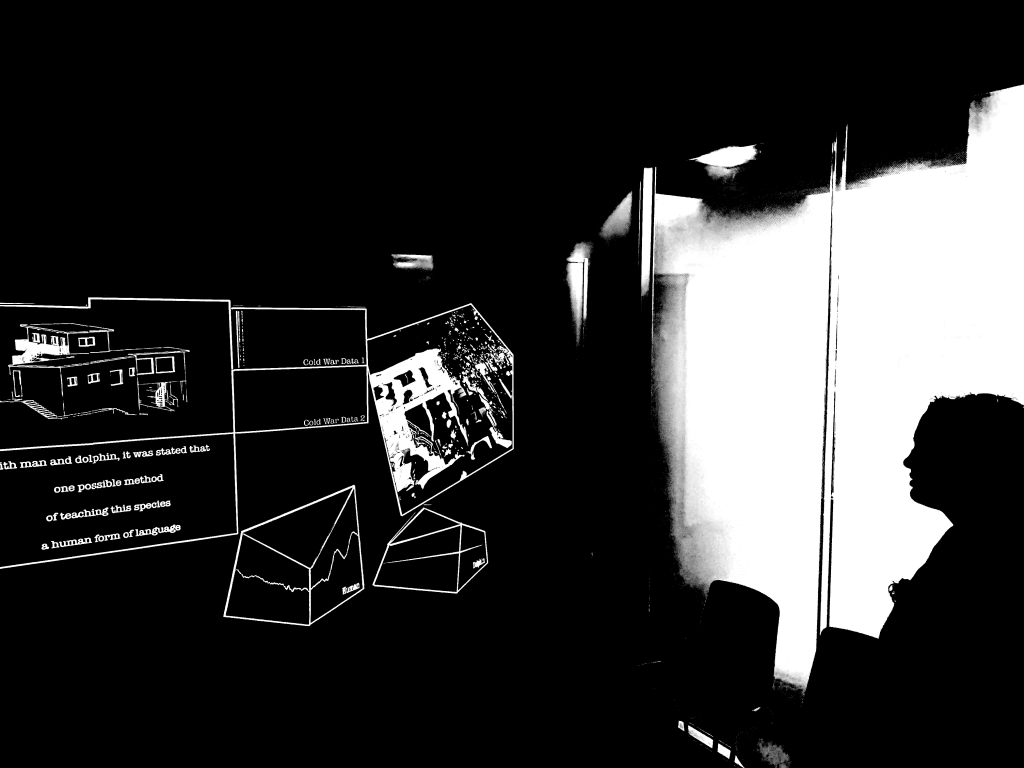 Unintentionally, the recording system picked up various types of “noise”: elemental (e.g., water and wind), technological (e.g., tape hiss), and social (conversations that were not so much documenting interspecies communication research but expressing frustration with various aspects of working at the lab). These noises have been processed and arranged in installation to create a “sonic blueprint” of the CRI and its interior spaces. Like the blueprint for a building, which outlines the spaces for people and objects as well as the underlying infrastructure, the sound composition of the installation has several layers which in this case correspond to human-dolphin communication research practices and the military-scientific apparatus that supported it. The sound composition pieces together parts of the CRI’s archival recordings into separate streams of sound for humans and dolphins which periodically interact. Additionally, the sound composition situates the CRI’s work within the broader military-scientific infrastructure of remote sensing. The installations other sonic layers were produced by “following the money,” that is, by retracing the CRI’s funding agencies and their activities around the world during the 1960s. In this way, the installation foregrounds what was so often left out of contemporaneous popular media and scientific discourse about Lilly’s work: the fact that the CRI was, from a military perspective, one node among many in a planet-spanning network of command, control and communication.