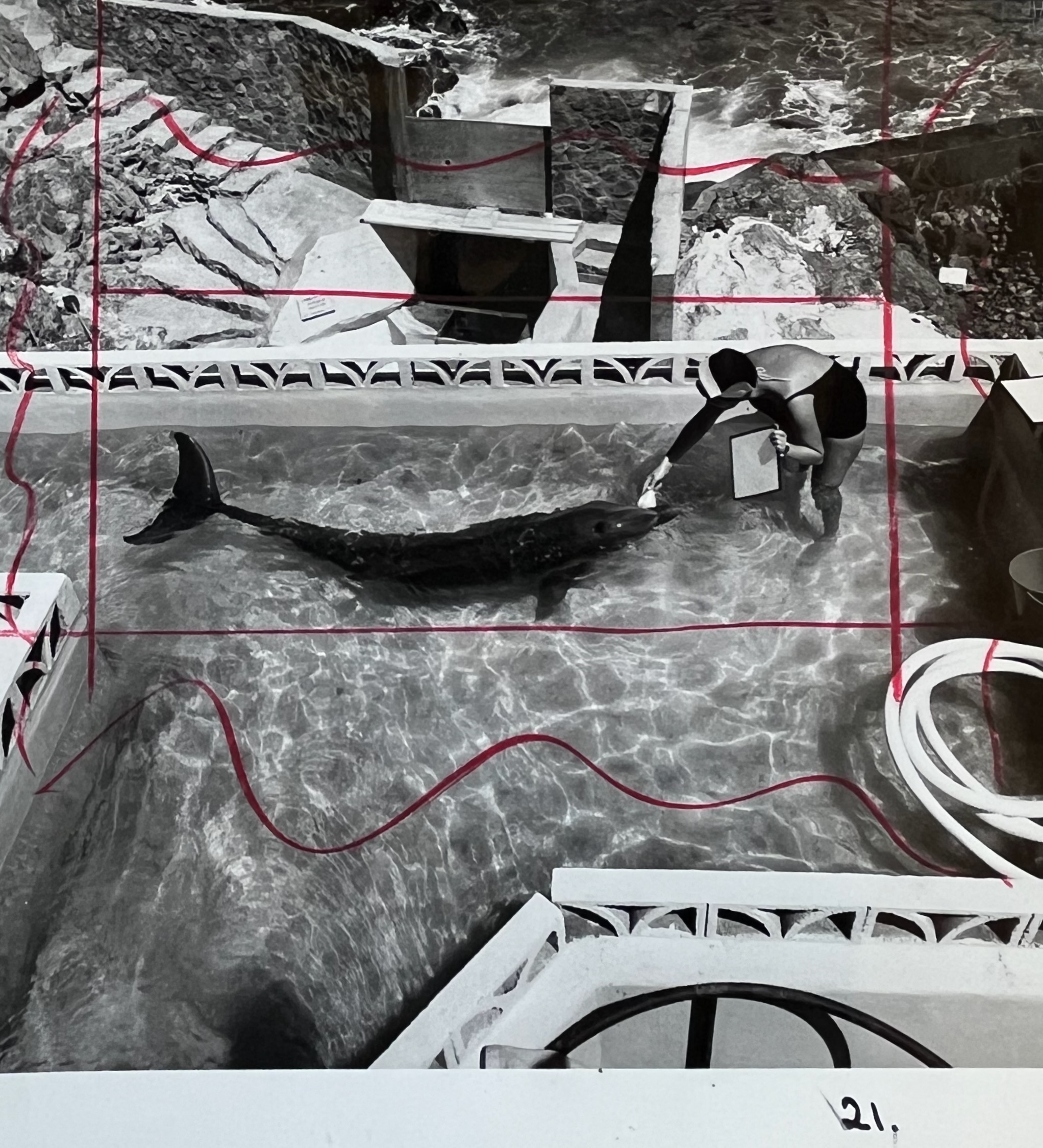 One of Lilly’s key collaborators, who can be heard in several parts of installation, was Margaret Howe. Howe was a key figure in the development and implementation of a months-long experiment in which she would live with a dolphin 24-hours a day for several months to accelerate the “reprogramming” of dolphins to communicate with humans (a story that has been retold in a number of news stories in recent years as well as a BBC documentary). The redesigned lab, informally referred to as the “flooded house” or the “dolphin house,” was configured to facilitate prolonged human and dolphin cohabitation through, for example, rooms and a balcony flooded with 18 inches of water. It was also fitted with microphones suspended from the ceilings to record dolphin vocalizations as well as Plexiglas tanks in which dolphins would listen to recordings of human speech and be rewarded with fish for attempting to mimic the sounds of the humans. Just as the house was flooded to bring human and dolphin participants close together for weeks or even months at a time, so too the house was saturated with acoustic technologies for capturing and manipulating the vocal sounds of humans and dolphins.