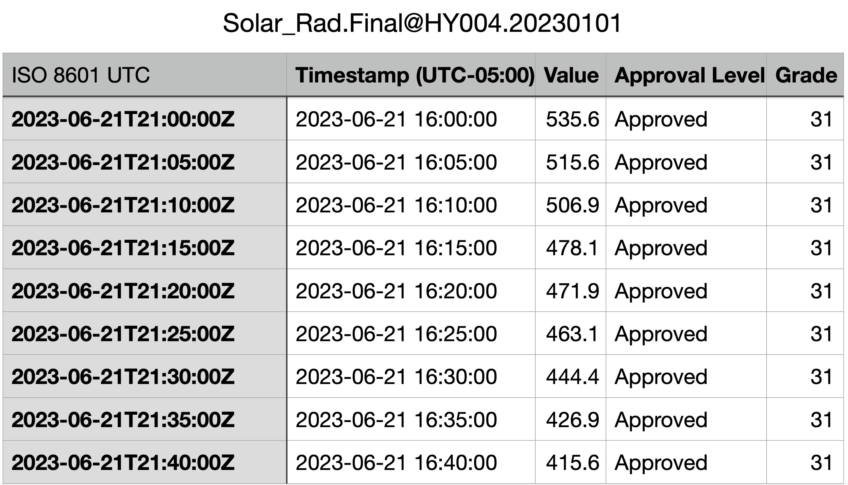 The first step in creating this soundscape was to access the data. I was able to obtain measurements of water level, water temperature, water flow, precipitation and solar radiation data from the TRCA’s Open Data Portal. What makes the TRCA data so useful for this project is that is the sensor readings are captured very frequently. For certain types of data, such as solar radiation, the sensor readings are captured every 5 minutes, in others cases, such as water temperature, they are captured every 15 minutes. This is very high resolution data – much higher than one would normally find in public databases of historical weather. To give you an idea of the resolution, there were 34,969 measurements of water temperature and 123,792 of solar radiation covering the period January 1 – December 31, 2023. Below is a sample of the solar radiation data from the TRCA Open Data Portal (value = watts per square metre) from 12:00 – 12:40 pm on June 21st, 2023.