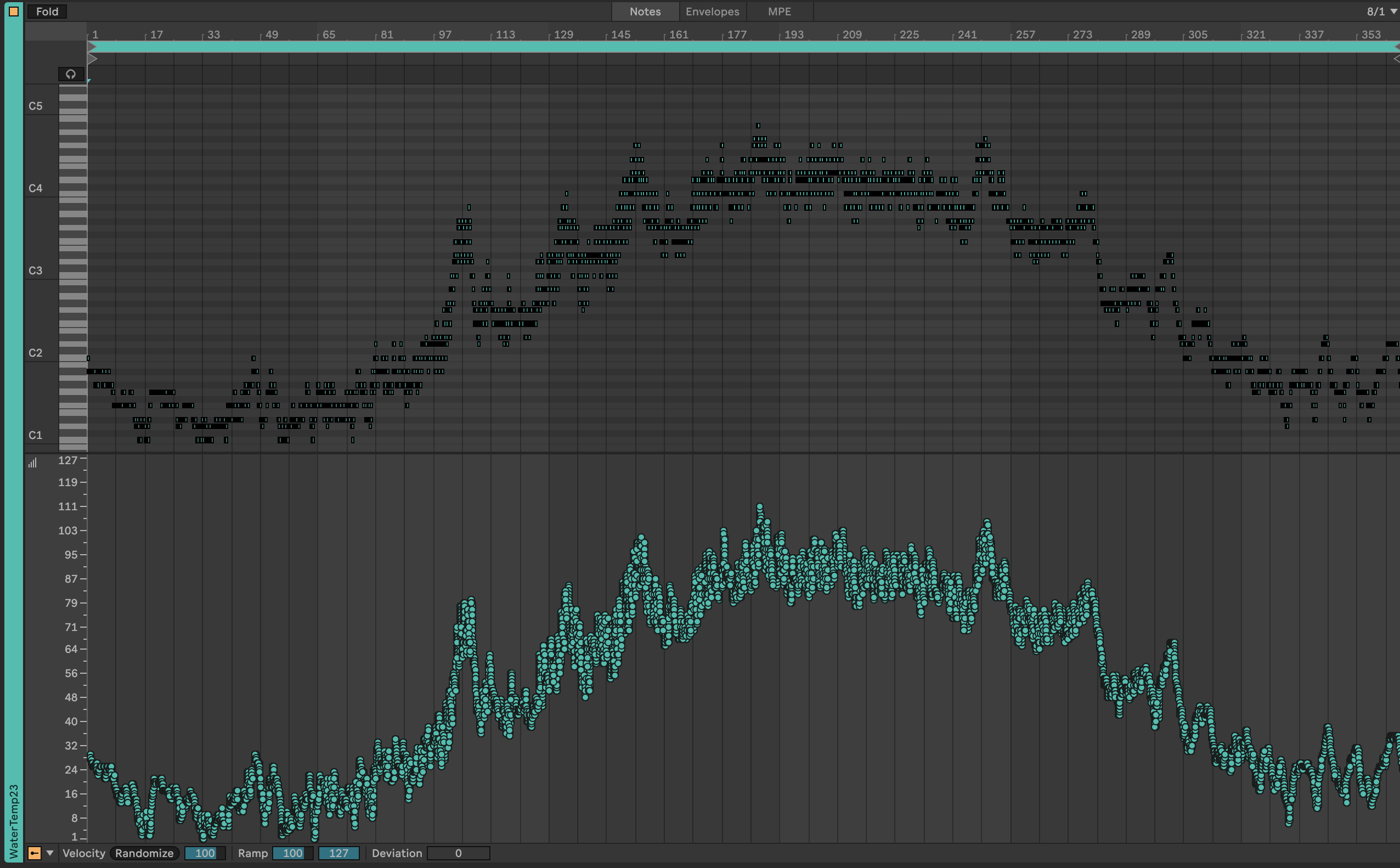 With the tempo set to 60 beats per minute and the amount of time to represent a year set to 1,460 seconds, I was able to make each day correspond to a bar of music in 4/4 time. This helped me keep track of where I was in terms of days of the year as I was composing the piece in the DAW. A year of time in the data set corresponds to 1,460 seconds (24 minutes and 20 seconds) in the composition, which means the MIDI files were 24 minutes and 20 seconds long.