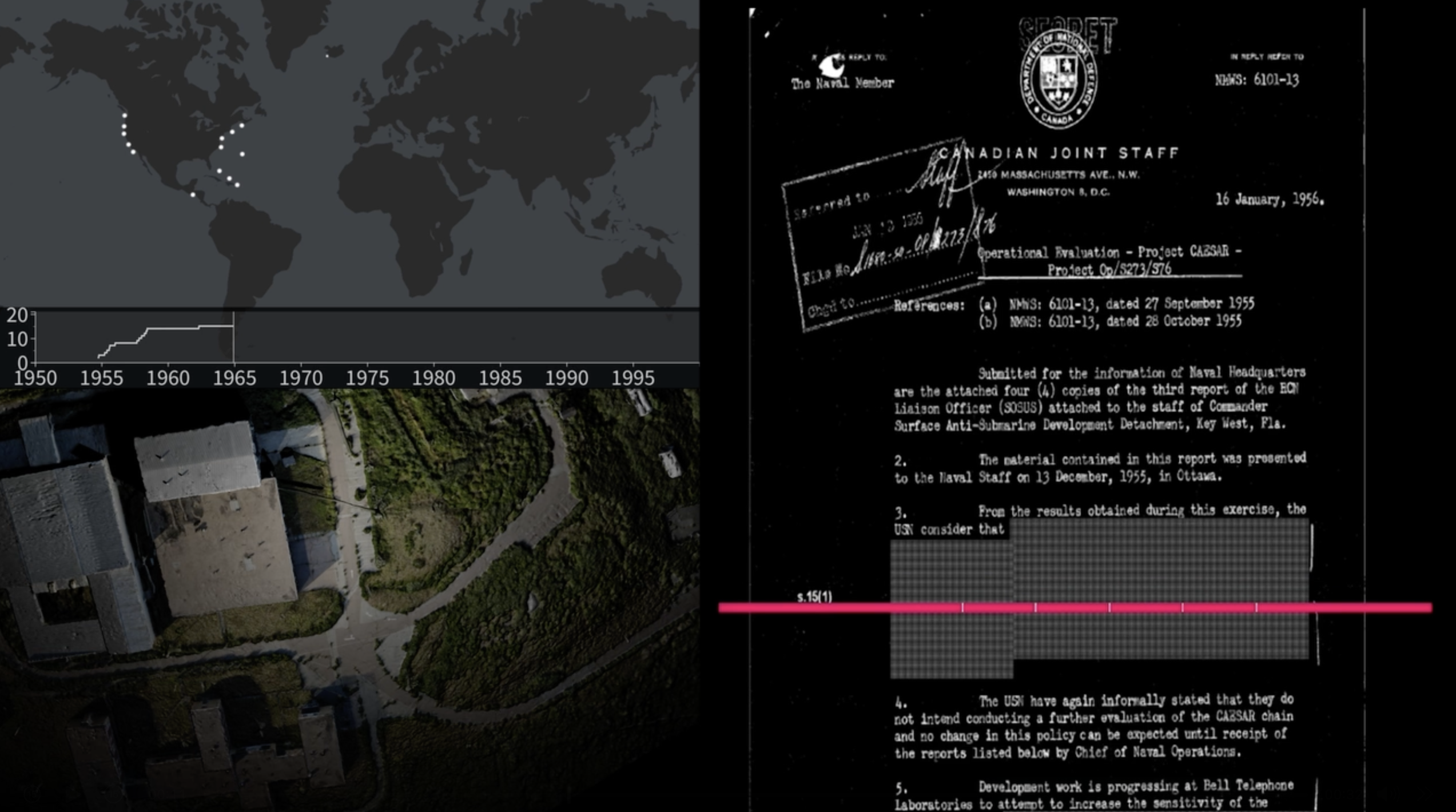 As with the physical platform discussed above, which will be displayed in and redesigned by two communities in Atlantic Canada, the virtual platform will facilitate exploration of future uses a SOSUS-like acoustic “observatory”: how might the SOSUS network be reconfigured to constitute new forms of acoustic community, knowledge and experience? This latter component will be particularly useful for collecting stakeholders’ ideas about how to develop a larger-scale installation for engaging with Canada’s role on in enacting the acoustic front or border and its “vertical territory” in the Atlantic during the Cold War. The process of developing this experimental assemblage will be presented in a white paper to cultural heritage organizations and the Directorate of History and Heritage (DHH) outlining the value of material artifacts from the NAVFACs in Canada as sites of cultural memory and as platforms for public engagement with the audible history of military ocean sensing.